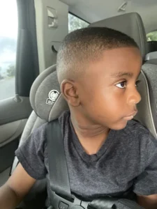 Haircuts for kids under 8 years old using a booster seat for comfort and safety.